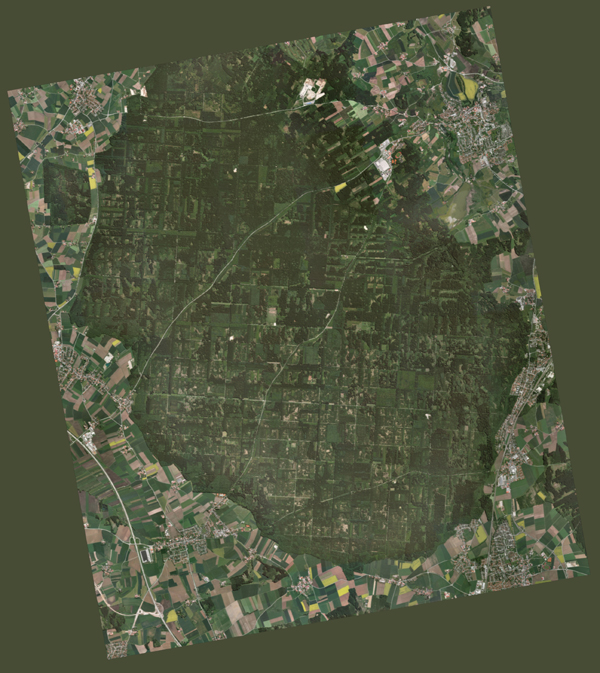 Der Ebersberger Forst im heutigen Luftbild: Konstanz einer Landschaft Zum Vergleich ist die Aufnahme wie die Planaufnahme des Anzinger Forsts [hier der untere Teil] aus dem 18 Jahrhundert eingenordet [Norden am linken Bildschnitt] [DOP ©BayerischeVermessungsverwaltung]