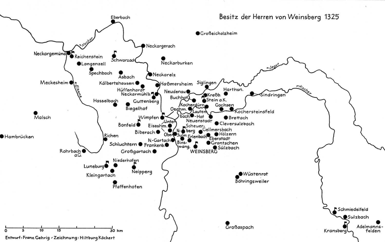 Besitz der Herren von Weinsberg, 1325. (Abb. aus: Gehrig, Besitz der Herren von Weinsberg, in: Zeitschrift für die Geschichte des Oberrheins 125 [1977], 65)