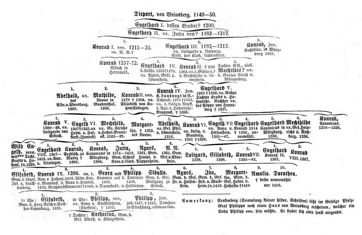 Stammbaum der Herren von Weinsberg, 1860. Abb. aus: Ferdinand L. Dillenius, Weinsberg, vormals freie Reichs-, jetzt württemb. Oberamtsstadt. Chronik derselben, Stuttgart 1860, 53 (Bayerische Staatsbibliothek, Germ.sp. 114l)