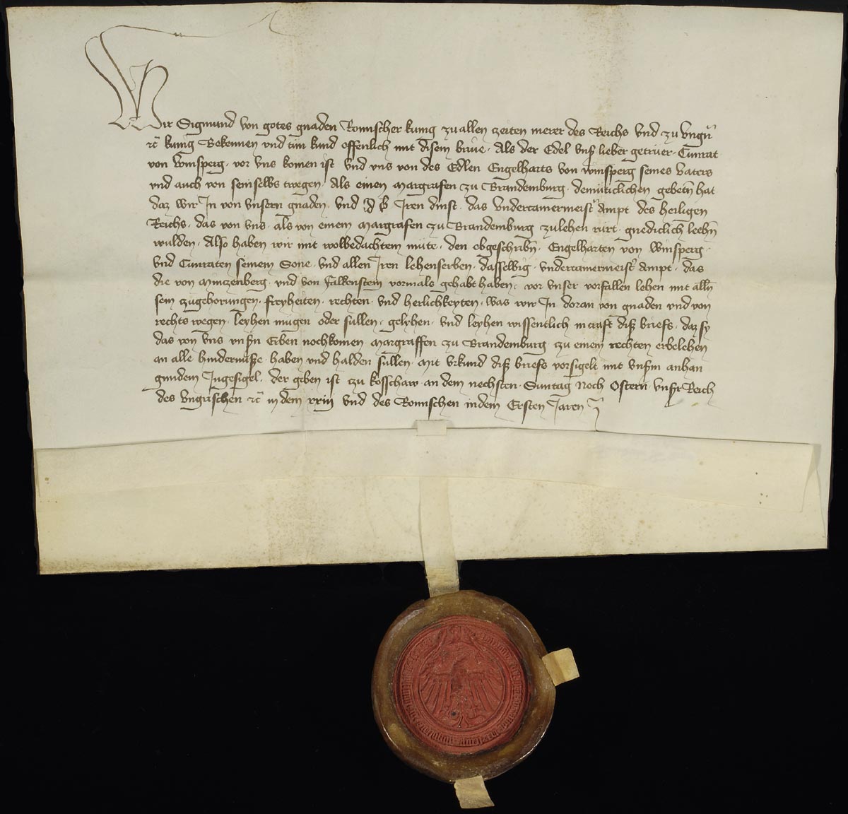 König Sigmund verleiht als Markgraf von Brandenburg am 19. April 1411 Konrad und Engelhard von Weinsberg das Unterkammermeisteramt. (Foto: Hohenlohe-Zentralarchiv Neuenstein, GA 15 Schubl. A Nr. 2)