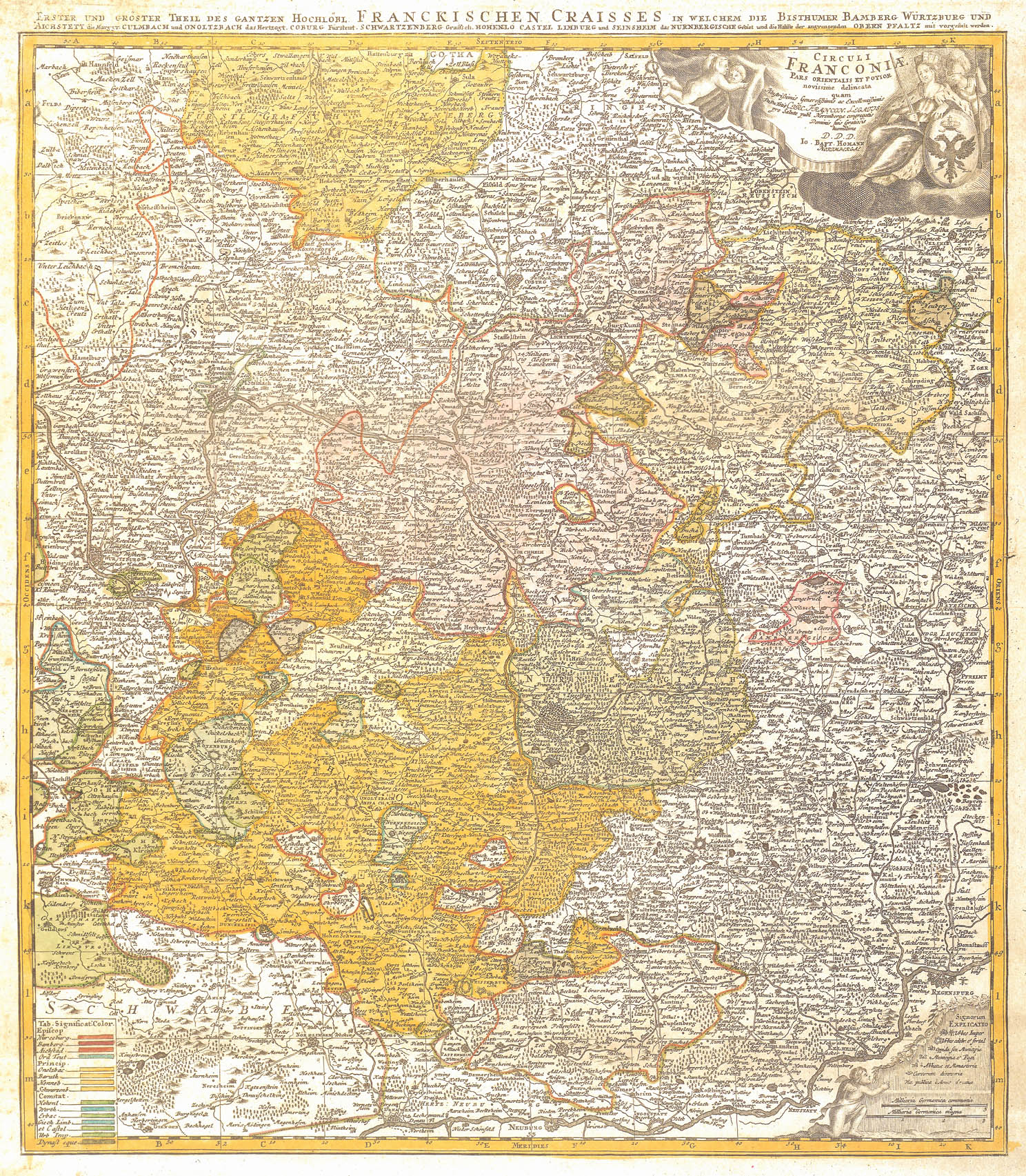 Johann Baptist Homann, Erster und größter Theil des gantzen hochlöbl. Fränckischen Craises [...], Karte 1720. Die Auflösung des Heiligen Römischen Reichs und damit die Auflösung des Fränkischen Reichskreises führte zu permanenten Gebietsveränderungen über rund ein Jahrzehnt hinweg. (Staatsarchiv Nürnberg, Rep. 504, Karten und Pläne, Allg. Reihe, Nr. 0100)