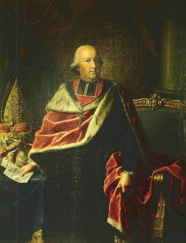 Das wohl 1802 entstandene Porträt des letzten Würzburger Bischofs Georg Karl von Fechenbach [1749-1808] zeigt als Insignien geistlicher und weltlicher Macht ein Bischofs-Mitra, einen Herzogshut und das Grumbachsche Herzogsschwert Das Gemälde von Christoph Fesel [1737-1805] befand sich bis 2005 in Schloss Laudenbach und wurde dann vom Deutschen Historischen Museum, Berlin, erworben [Privatsammlung Alois Reiß,Laudenbach]