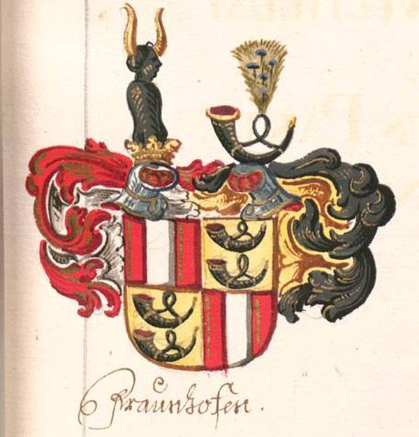 Wappen der Adelsfamilie Fraunhofen. (in: Des Johann Michael Wilhelm von Prey, freisingischen Hofcammer-Directors, Sammlung zur Genealogie des bayrischen Adels, in alphabetischer Ordnung, 1740. (Bayerische Staatsbibliothek, Cgm 2290 [28], fol. 78)