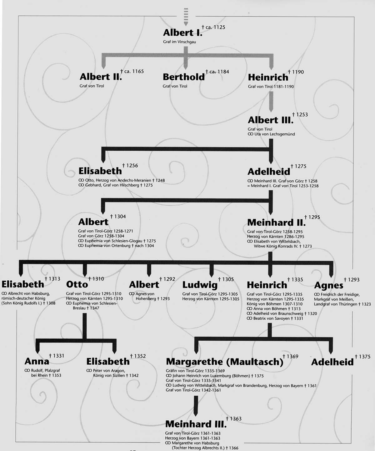 Stammbaum der Grafen von Tirol und Görz. Abbildung aus: Josef Riedmann (Hg.), Eines Fürsten Traum, Meinhard II. - das Werden Tirols, Dorf Tirol 1995, 37. (Südtiroler Landesmuseum für Kultur- und Landesgeschichte Schloss Tirol)
