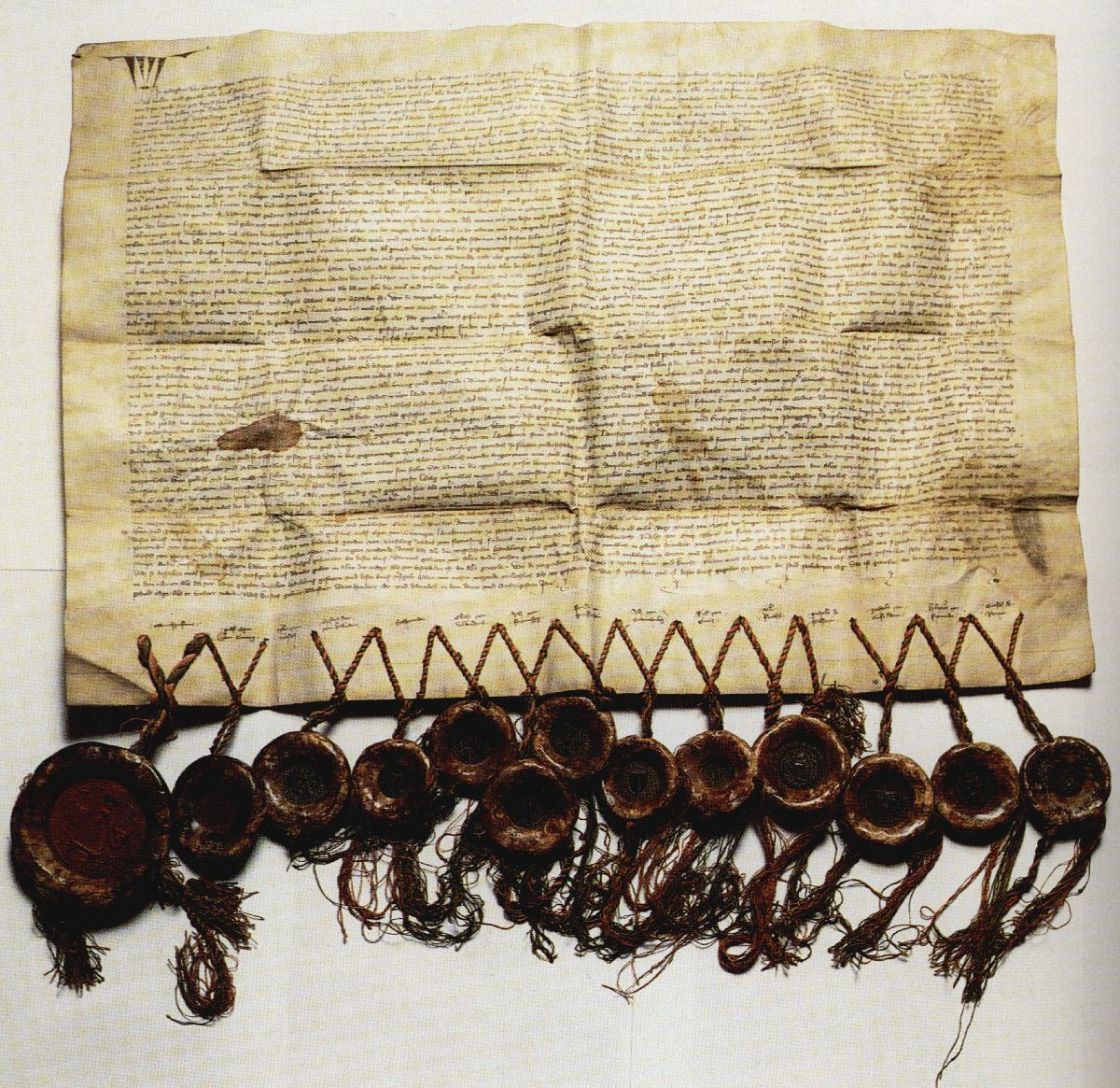 Das Testament der Margarethe Maultasch (1318-1369), mit dem sie die Habsburger 1363 zu ihren Erben bestimmte. Die Urkunde ist in drei Ausfertigungen überliefert. Die hier abgebildete befand sich bis 1963 im Bayerischen Hauptstaatsarchiv und wurde dann nach Tirol verschenkt. Zwei weitere Ausfertigungen besitzt das Haus-, Hof- und Staatsarchiv in Wien. (Tiroler Landesarchiv, Urkunde I/9789)