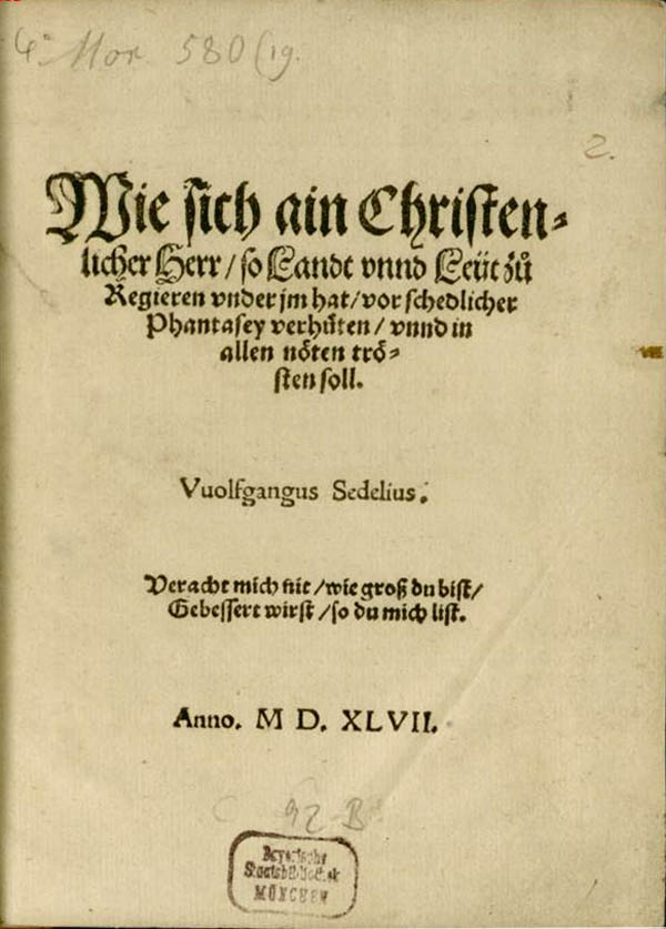 Titelblatt des von Wolfgang Seidel verfassten Fürstenspiegels "Wie sich ain Christenlicher Herr, so Landt vnnd Leüt zu Regieren vnder jm hat, vor schedlicher Phantasey verhüten, vnnd in allen nöten trösten soll", Augsburg 1547. (Bayerische Staatsbibliothek)
