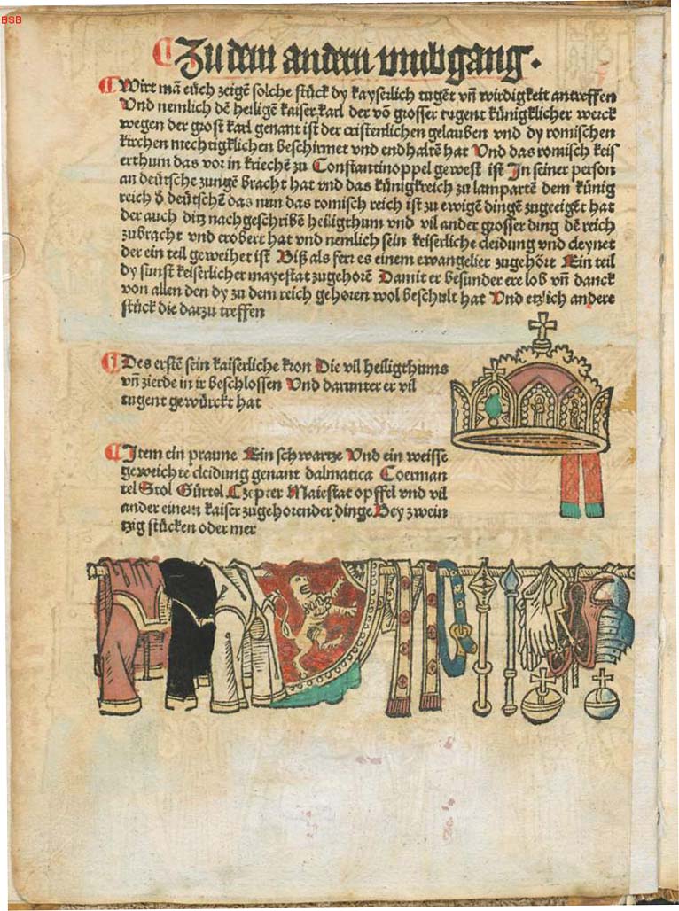 Die Reichskrone, die verschiedenen Gewänder und der Reichsapfel. Abb. aus: Wie das hochwirdigist Auch kaiserlich heiligthum. Vnd die grossen Römischen gnad darzu gegeben. Alle Jaer außgeruefft vnd geweist wirdt, Nürnberg 1487, fol. 192v. (Bayerische Staatsbibliothek, 4 Inc.c.a. 514)