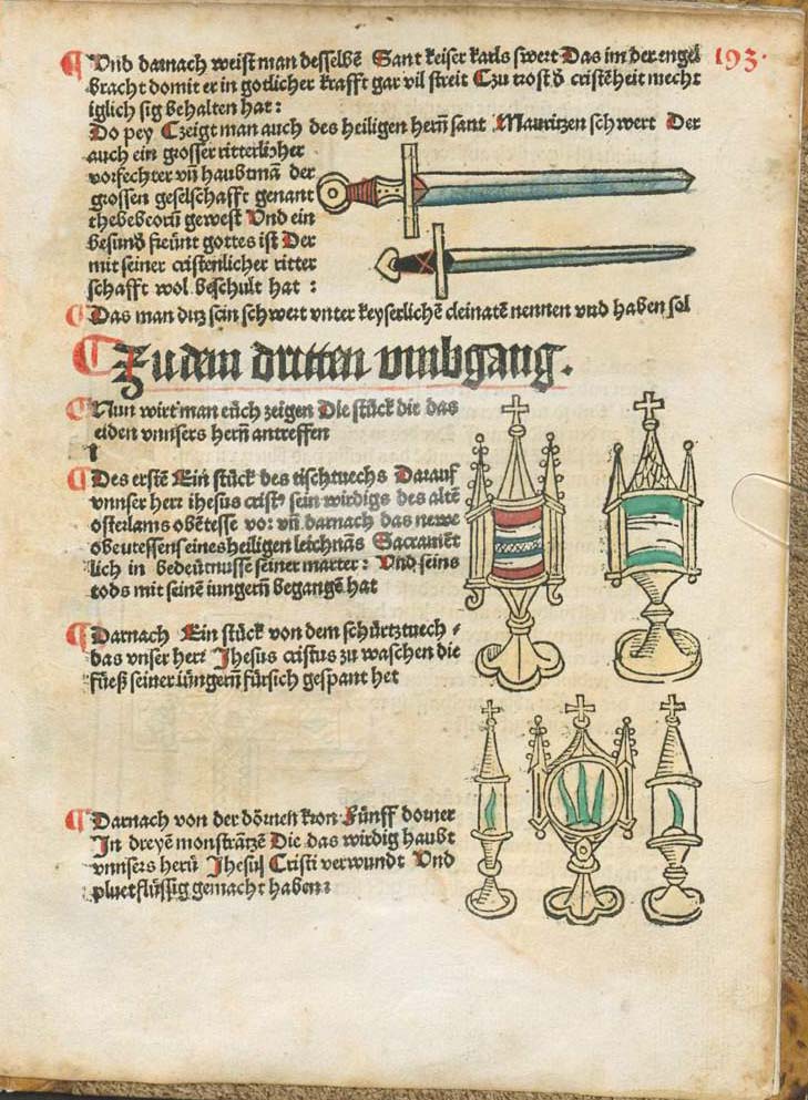 Reichsschwert, Zeremonienschwert und Reliquiare Urbans V. Abb. aus: Wie das hochwirdigist Auch kaiserlich heiligthum. Vnd die grossen Römischen gnad darzu gegeben. Alle Jaer außgeruefft vnd geweist wirdt, Nürnberg 1487, fol. 193r. (Bayerische Staatsbibliothek, 4 Inc.c.a. 514)