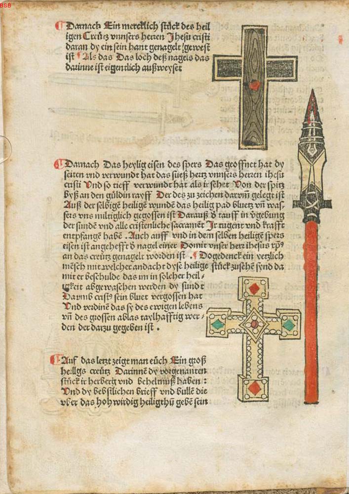 Reichskreuz, Heilige Lanze und kreuzförmiger Reliquienbehälter. Abb. aus: Wie das hochwirdigist Auch kaiserlich heiligthum. Vnd die grossen Römischen gnad darzu gegeben. Alle Jaer außgeruefft vnd geweist wirdt, Nürnberg 1487, fol. 193v. (Bayerische Staatsbibliothek, 4 Inc.c.a. 514)