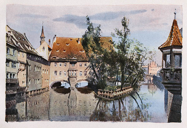 Das Heilig-Geist-Spital in Nürnberg, Aufbewahrungsort der Reichskleinodien von 1424 bis 1796 Aquarell von Otto Wiegk [gest 1914] [Bayerische Staatsbibliothek,Bildarchiv]