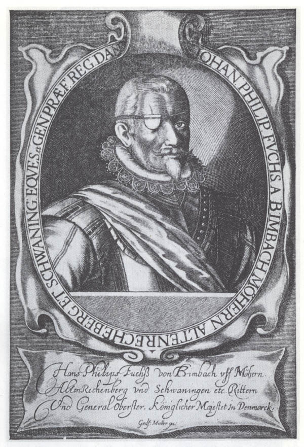 Johann Philipp Fuchs von Bimbach, dänischer General, gefallen 1626. Bei dem mit "Godf. Muller" bezeichneten Kupferstecher handelt es sich wohl um den Braunschweiger Verleger und Kupferstecher Gottfried Müller (erw. 1626-1658). Der Stich, der auch in Schloss Burgpreppach vorhanden ist, wurde erstmals anscheinend gedruckt in: Das Bayerland 10 (1899), 198.