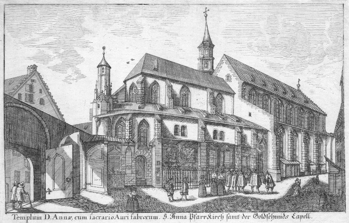 Die St.-Anna-Kirche in Augsburg auf einem Stich aus der Ansichtensammlung "Augusta Vindelicorum" von Simon Grimm, 1704. Die Fuggerkapelle befindet sich im Westchor (re.). (Foto: Bayerische Staatsbibliothek)