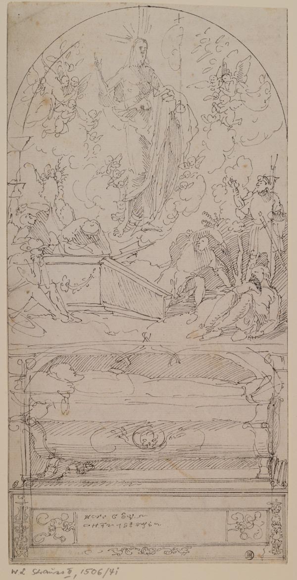 Auferstehung Christi, Entwurf von Albrecht Dürer (1471-1528) für das Epitaph Ulrich Fuggers. Insgesamt sind sechs Zeichnungen überliefert, in denen sich Dürer mit der Fuggerkapelle befasste. (Foto: Germanisches Nationalmuseum)