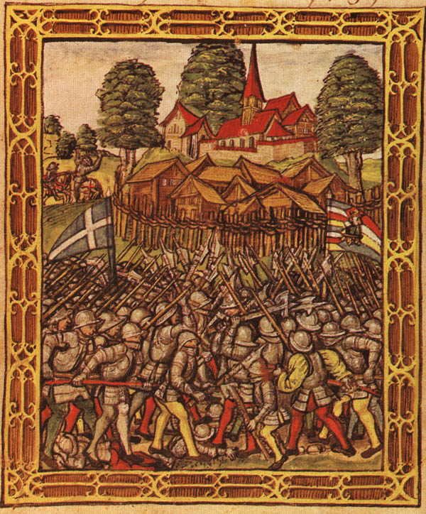 Sieg der Eidgenossen über die Truppen des Kemptner Fürstabtes bei Buchenberg am 17. März 1460. Darstellung aus Diebold Schillings (gest. 1515) Eidgenössischer Chronik. ("Diebold-Schilling-Chronik 1513". Eigentum der Korporation Luzern)