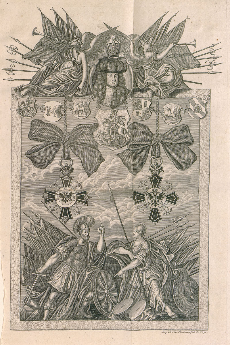 Darstellung der kaiserlichen Gnadenzeichen für die Würdenträger (Ritterräte, Ritterhauptleute) sowie der Wappen der sechs Ritterkantone, aus: "Des Hl. Rom. Reichs ohnmittelbarer Freyer Ritterschaft der Sechs Orte in Franken erneuerte Ordnung, 1720". (Staatsarchiv Bamberg, Amtsbücherei19^8)