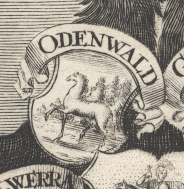 Wappen des Ritterkantons Odenwald. (aus: Des Heiligen Römischen Reichs ohnmittelbahr-Freyer Ritterschafft, Der Sechs Ort in Francken, erneuert- vermehrt- und confirmirte Ordnungen. 1724, Ausschnitt aus dem Frontispiz)