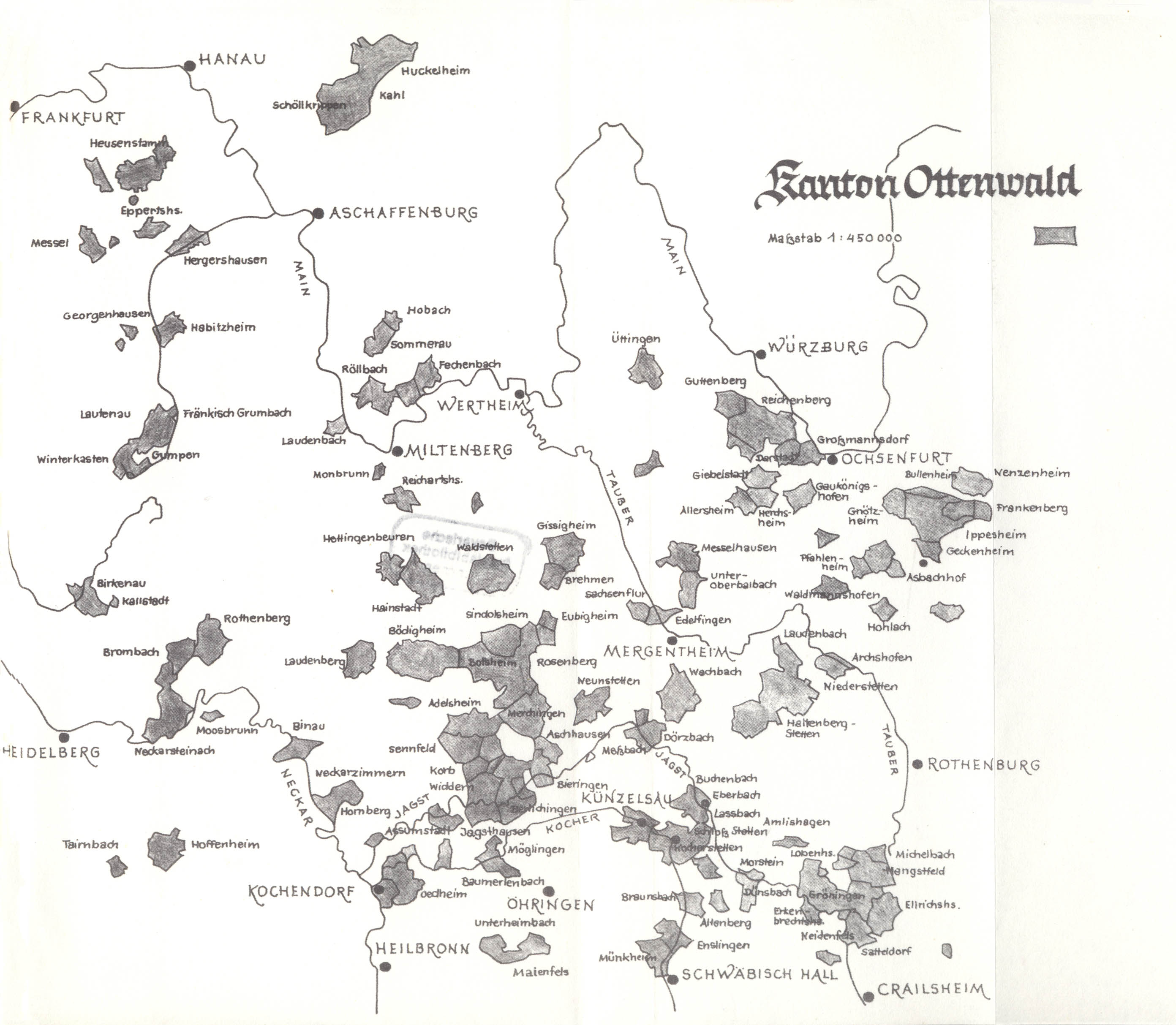 Übersichtskarte des Kantons Odenwald. (aus: Wolfgang von Stetten, Die Rechtsstellung der unmittelbaren freien Reichsritterschaft, ihre Mediatisierung und ihre Stellung in den neuen Landen, dargestellt am fränkischen Kanton Odenwald [Forschungen aus Württembergisch Franken 8], Schwäbisch Hall 1973)