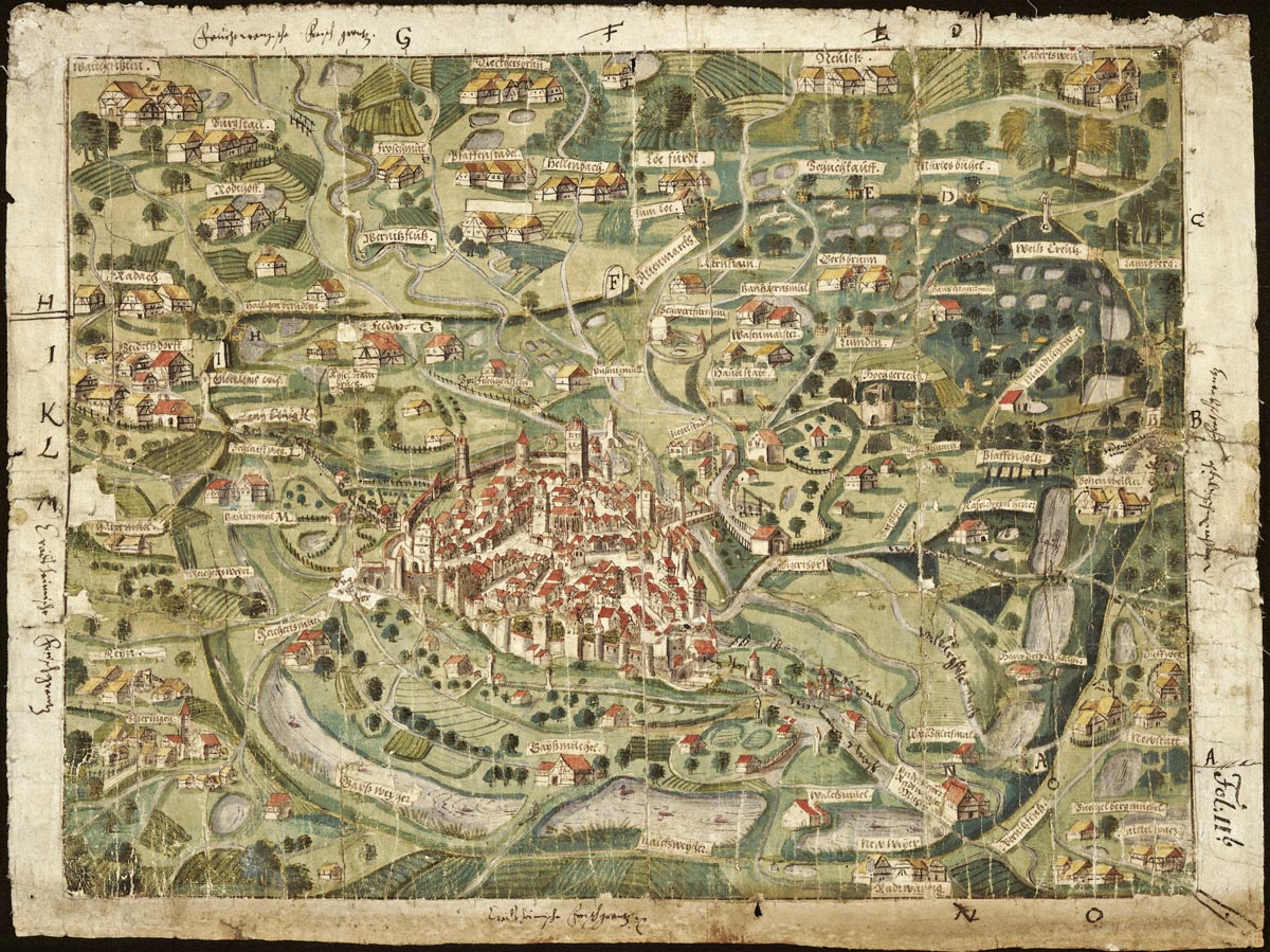 Ansicht des reichsunmittelbaren Dinkelsbühler Territoriums auf einem Plan von 1586. Der genordete Plan besticht durch seine Detailgenauigkeit, mit der Stadt und Umland dargestellt sind. (Staatsarchiv Nürnberg, Fürstentum Brandenburg-Ansbach, Karten und Pläne, Nr. 570)