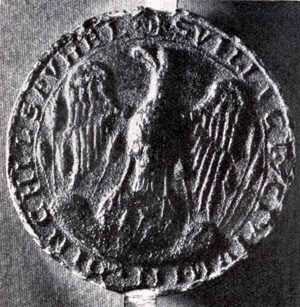 Ältestes Stadtsiegel an einer Urkunde vom 18 Februar 1387 Das Siegel zeigt den Reichsadler Demgegenüber zeigt das Sekretsiegel der Stadt schon das den Dinkel Bezug nehmende Wappen [KunstdenkmälerDinkelsbühl]
