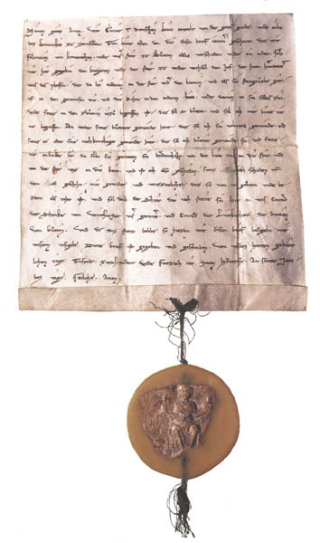 König Konrad IV. (reg. 1250-1254) bezeichnet Kaufbeuren als "vnser stat zu Buoeron". Erste deutschsprachige Königsurkunde (25. Juli 1240). (Staatsarchiv Augsburg)