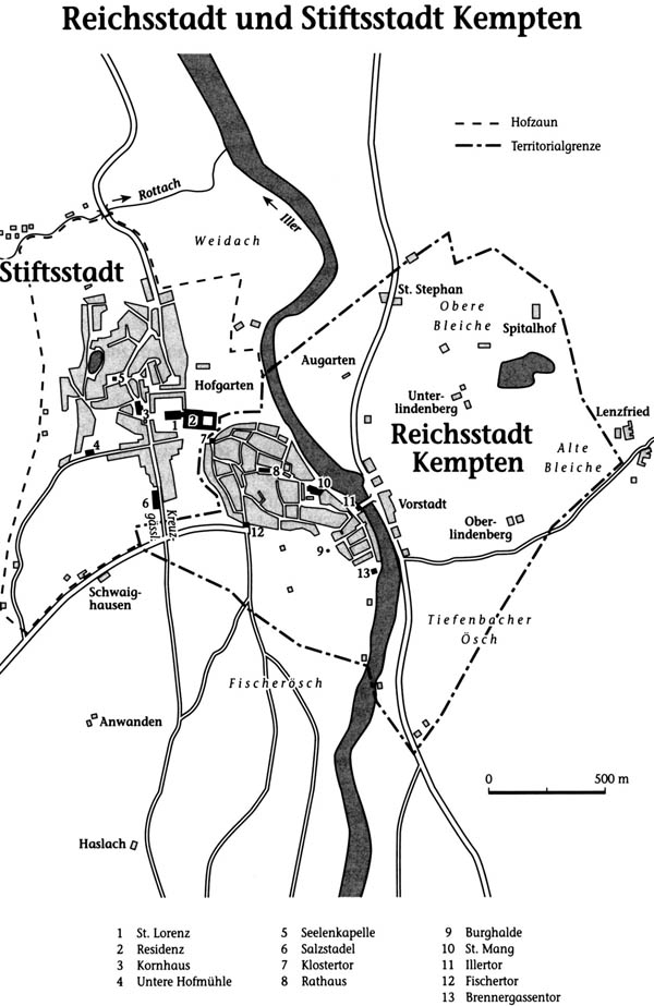 Reichsstadt und Stiftsstadt Kempten im 18. Jahrhundert. (Karte: Wolfgang Petz)