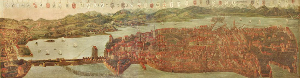 Gesamtansicht der Reichsstadt Lindau von 1579 auf einem fast fünf Meter großen Ölgemälde. Vom oberen Bildrand hängen 40 Wappen und Hausmarken von Lindauer Bürgern herab. Stadtbild und -grundriß mit Stadtmauer und Hafen sind gut erkennbar. (Foto: Städtisches Museum Haus zum Cavazzen, Lindau am Bodensee)