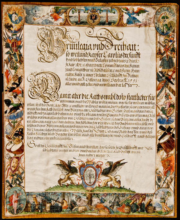 Privilegientafel der Reichsstadt Lindau von ca. 1620. Kopie des Erlasses, mit dem Kaiser Karl V. die Zunftherrschaft aufhob und das Stadtregiment den Sünfzen zurückgab. (Foto: Städtisches Museum Haus zum Cavazzen, Lindau am Bodensee)