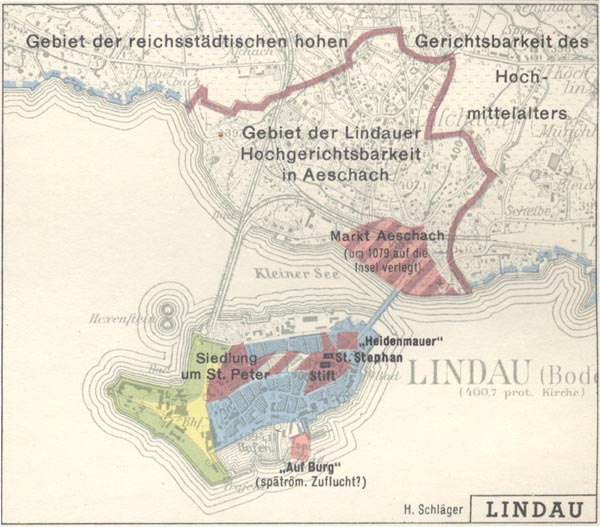Karte der Stadt Lindau vor den größeren Uferkorrekturen des 19. Jahrhunderts, mit den inneren Gerichten auf dem Festland, die der lindauischen Hochgerichtsbarkeit unterstanden. (aus: Wolfgang Zorn [Hg.], Historischer Atlas von Bayerisch-Schwaben, Augsburg 1955, 32)