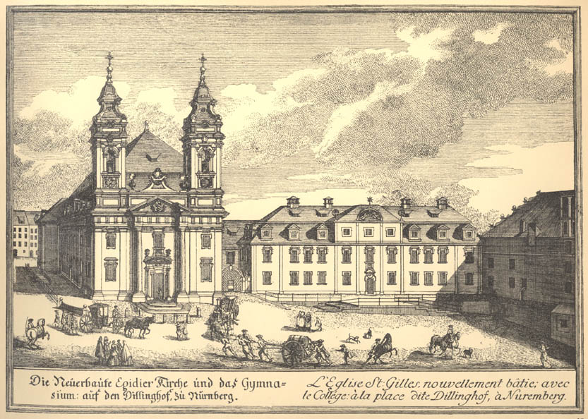 Die barocke Kirche von St Egidien und das Gymnasium Kupferstich von Johann Adam Delsenbach [1687-1765] [Bayerische Staatsbibliothek, Porträt- undAnsichtensammlung]