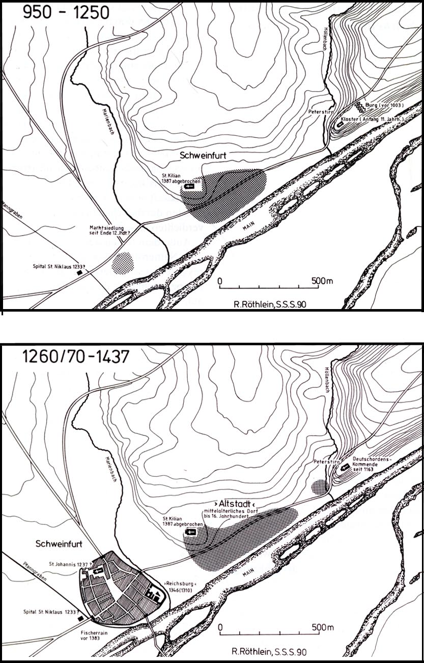 Hoch- und spätmittelalterliche Topographie von Schweinfurt Die obere Karte zeigt die hochmittelalterliche Burg samt dem Kloster Peterstirn sowie die alte Siedlung Schweinfurt um die Kilianskirche Die entstehende Stadt westlich des Marienbachs ist angedeutet Die untere Karte zeigt die spätmittelalterliche Topographie Die Anlagen auf der Peterstirn verschwanden noch im 15 Jahrhundert, die Schweinfurter Altstadt wurde im Laufe des 16 Jahrhunderts aufgelassen [aus: Dirk Rosenstock, Frühgeschichte der Stadt Schweinfurt von 700 bis 1550 Führer zur Ausstellung der Städtischen Sammlungen Schweinfurt im Alten Gymnasium [Schweinfurter Museumsschriften 49], Schweinfurt 1992, S11]