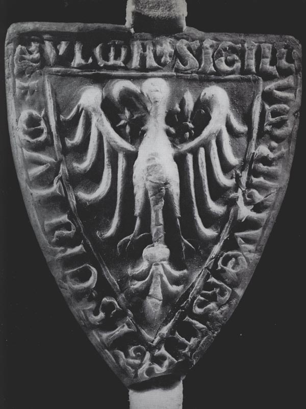 Ulmer Stadtsiegel von 1244. Im Siegelbild der Reichsadler (mit Stern und Lilie neben dem Hals). Die Umschrift lautet "Sigillum Universitatis Civium in Ulma". (aus: Hans Eugen Specker, Ulm. Stadtgeschichte, Ulm 1977, 15)