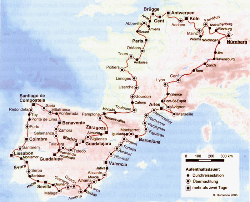 Reisewege des Nürnberger Gelehrten Dr. Hieronymus Münzer (um 1447-1508) durch Westeuropa. Nach den Nachrichten in seinem Bericht. (Abb. aus: René Hurtienne, Ein Gelehrter und sein Text. Zur Gesamtedition des Reiseberichts von Dr. Hieronymus Münzer, 1494/95 (Clm 431), in: Helmut Neuhaus (Hg.), Erlanger Editionen. Grundlagenforschung durch Quelleneditionen. Berichte und Studien (Erlanger Studien zur Geschichte 8), Erlangen/Jena 2009, 255)