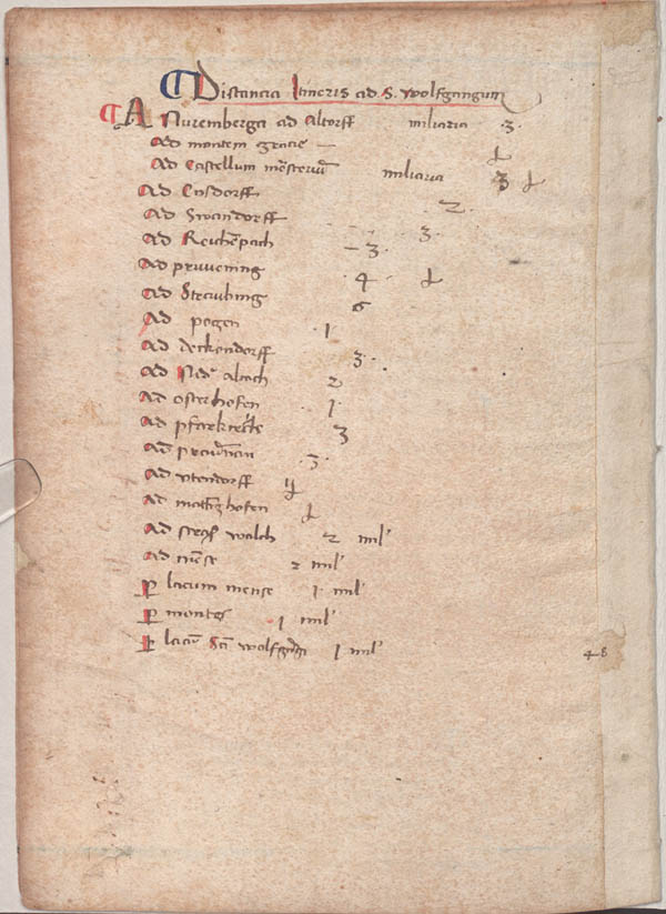 Itinerar aus dem eigenhändigen Tagebuch des Hartmann Schedel (1440-1514) über seine Wallfahrt von Nürnberg nach St. Wolfgang im Salzkammergut im Jahr 1488. (Bayerische Staatsbibliothek, clm 30165, fol. 2v)
