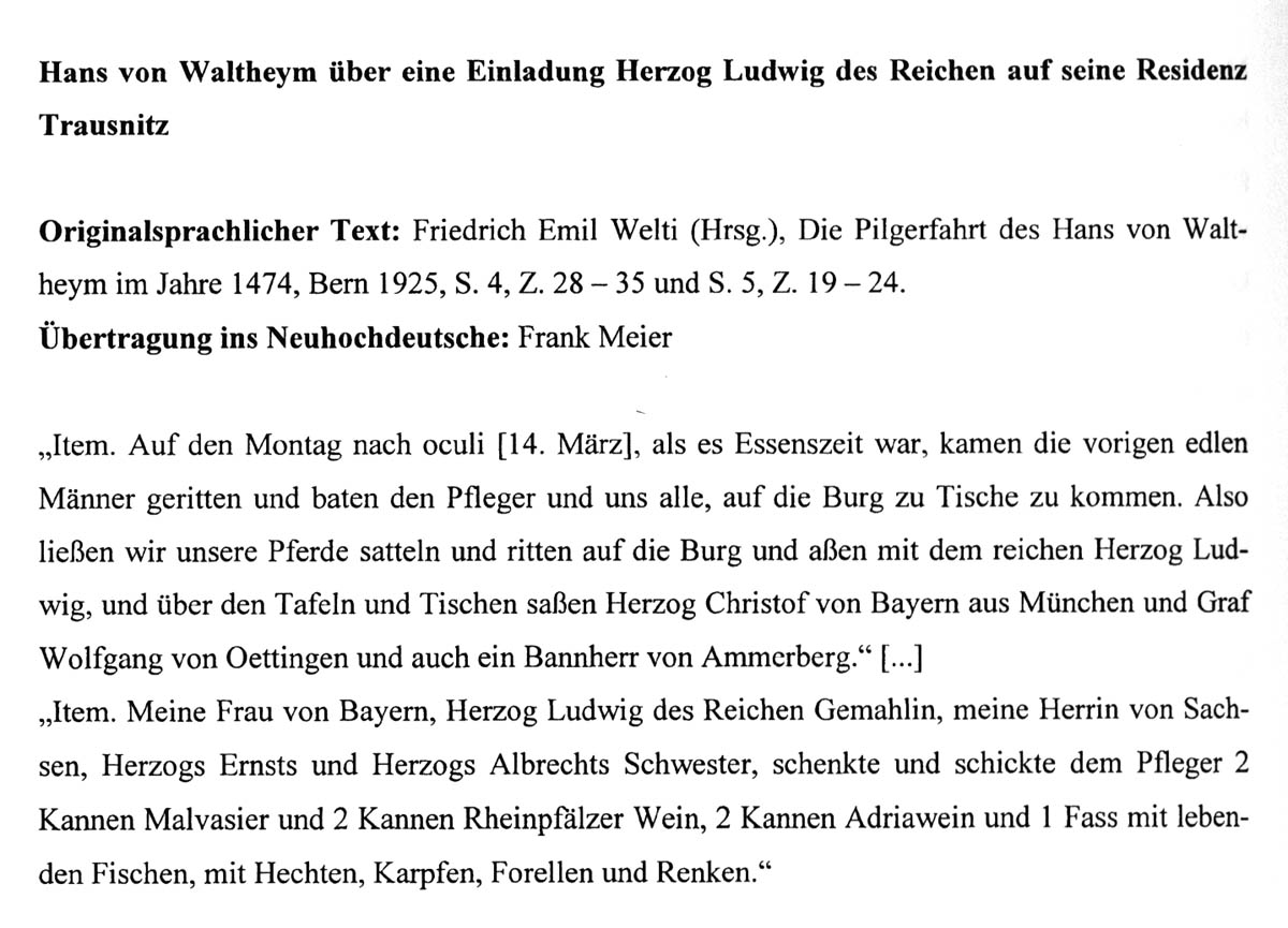 Bericht des Hans von Waltheym über die Einladung Herzog Ludwigs IX. des Reichen von Bayern-Landshut (reg. 1450-1479) auf die Burg Trausnitz. Übertragung ins Neuhochdeutsche von Frank Meier, Karlsruhe. (aus: Frank Meier, Hans von Waltheym auf Pilgerfahrt und Bildungsreise [Studien zur Geschichtsforschung des Mittelalters 18], Hamburg 2003, 276)