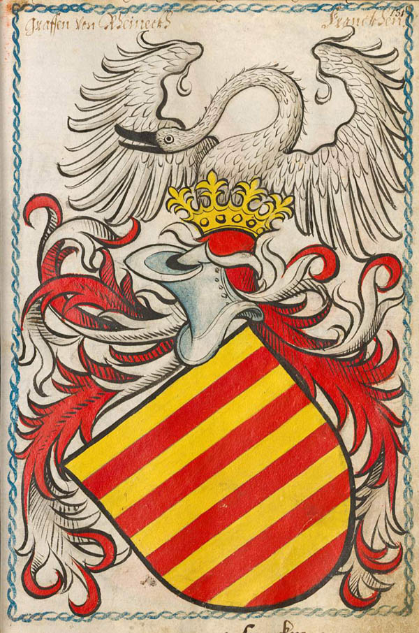 Wappen der Grafen von Rieneck im Scheiblerschen Wappenbuch um 1450/80. Das Rieneck'sche Wappen war mit dem der Grafen von Loon identisch. Seit der Mitte des 13. Jahrhunderts wurde es durch einen Schwan als Helmzier ergänzt; Loon führte einen Fächer. (Bayerische Staatsbibliothek, Cod.Icon. 312 c, fol. 131)
