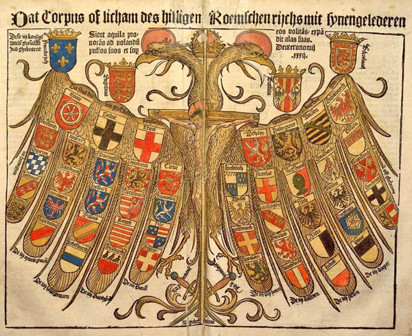 Die Rienecker in einer Quaternionen-Darstellung. Das Rienecker Wappen befindet sich in der vierten Federreihe (Burggrafen) von links als zweites von unten. Abb. aus: Johann Koelhoff der Jüngere, Chronik der Stadt Köln, Köln 1499. (Bayerische Staatsbibliothek, 2 Inc.s.a. 302)