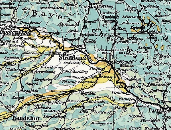 Wald- und Rodungsflächen im Straubinger Gäu um 900 n. Chr. Erläuterung der Farben: Dunkles Blau steht für den Waldbestand gegen Ende des 19. Jahrhunderts, das etwas hellere Blau für den seit etwa 900 n. Chr. gerodeten Wald, das helle Blau für den vor 900 n. Chr., v. a. im 8. und 9. Jahrhundert gerodeten Wald, das dunkle Pink für Eis- und Felsregionen des Hochgebirges, das hellere Pink für natürliche Hochweiden oberhalb der Baumgrenze, die weißen Flächen für Siedlungsräume in frühgeschichtlicher Zeit, das dunkle Gelb für am Ende des 19. Jahrhunderts noch sumpfig-mooriges Gelände bzw. eingeschränkte Überschwemmungsgebiete der Ströme, das hellere Gelb für ehemaliges Sumpfgelände bzw. natürliches Überschwemmungsgebiet der Flüsse. (Karte aus: Otto Schlüter, Die Siedlungsräume Mitteleuropas in frühgeschichtlicher Zeit, in: Forschungen zur deutschen Landeskunde 63, 74, 110, Remagen 1952-58)