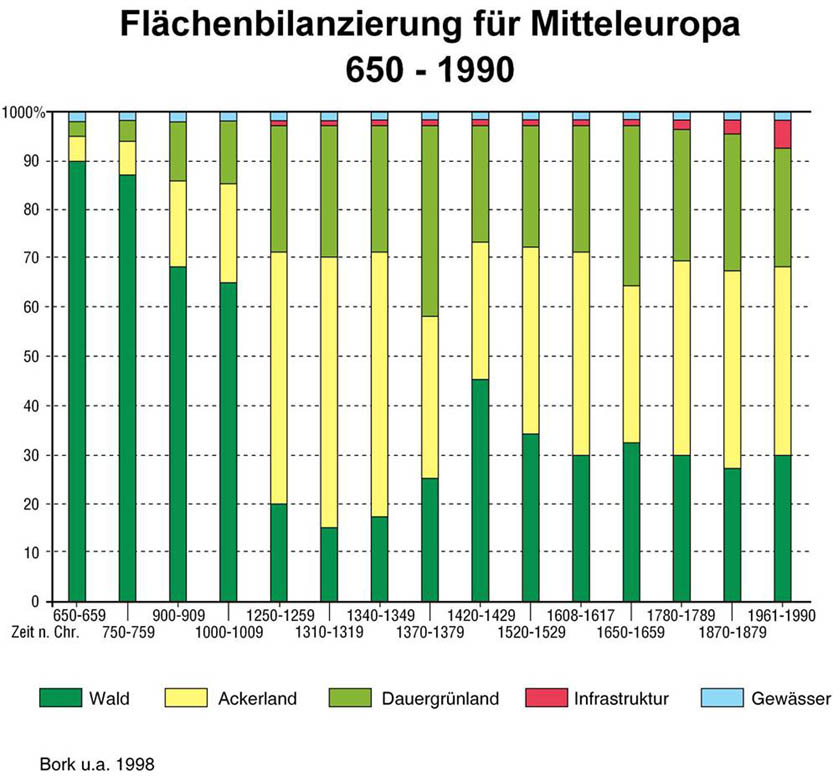 Wald-Offenland-Bilanzierung für Mitteleuropa ab 650. (Grafik von Winfried Schenk umgezeichnet, ursprünglich enthalten in: Hans-Rudolf Bork/Helga Bork/Claus Dalchow u. a., Landschaftsentwicklung in Mitteleuropa, Gotha 1998, 161f.)