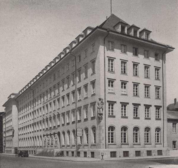 Das "Haus der landwirtschaftlichen Genossenschaften" in der Münchner Türkenstraße 16, erbaut 1922/23, bis 1977 Sitz des Bayerischen Raiffeisenverbands. (Abb. aus: Heinrich Rid/Ernst Hohenegg, Die Landwirtschaftlichen Genossenschaften und ihre Organisation in Bayern, München 1951, vor III)