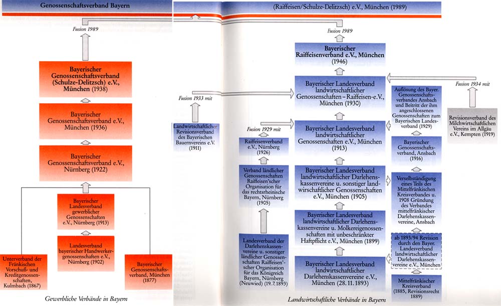 Entwicklung der Genossenschaftsverbände in Bayern. Abb. aus: Ludwig Hüttl, 1893–1993 Genossenschaftsverband Bayern (Raiffeisen/Schulze-Delitzsch) e.V., München. Eine Chronik der landwirtschaftlichen und gewerblichen Genossenschaftsverbände in Bayern seit dem 19. Jahrhundert, München 1993. (Ludwig Hüttl)