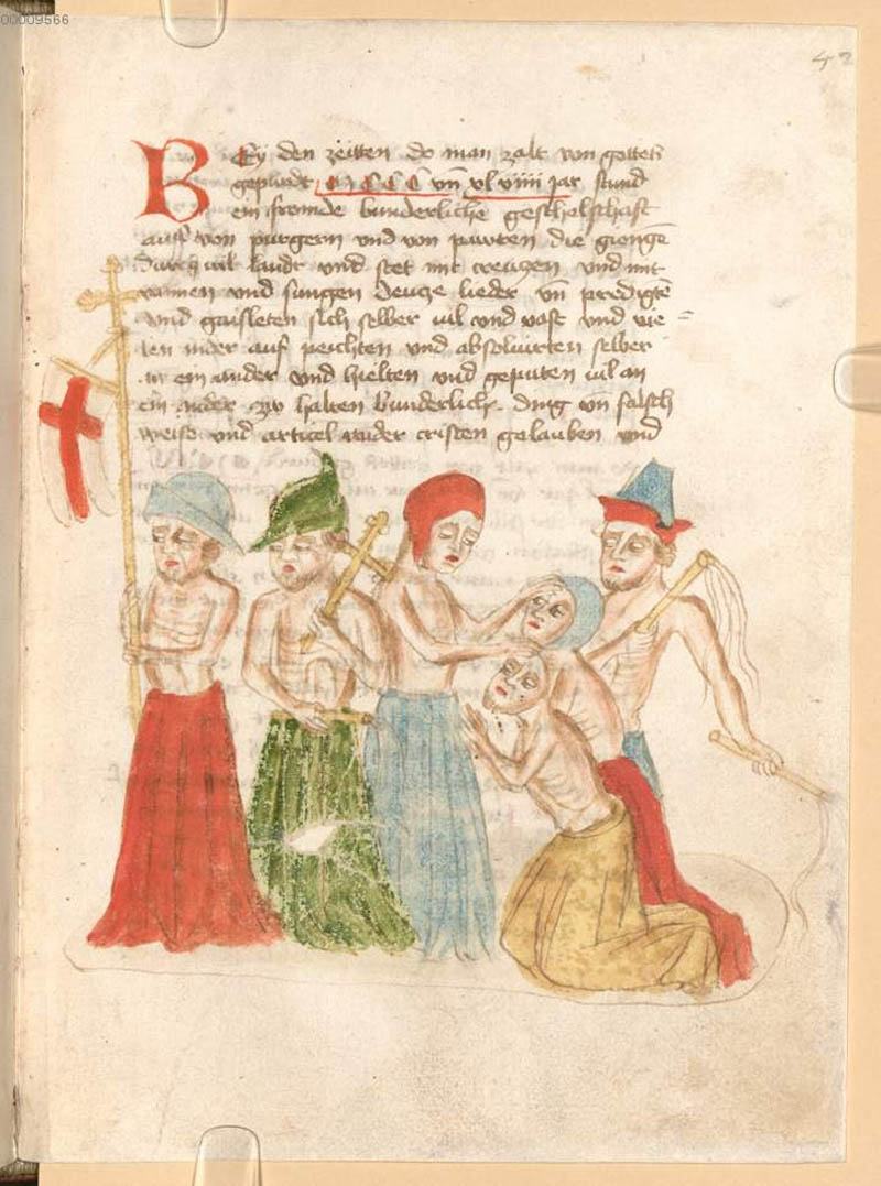 Abbildung eines Geißlerzuges in der Konstanzer Weltchronik bis 1370. (Staatsbibliothek München, Cgm 426, Bl.42r)