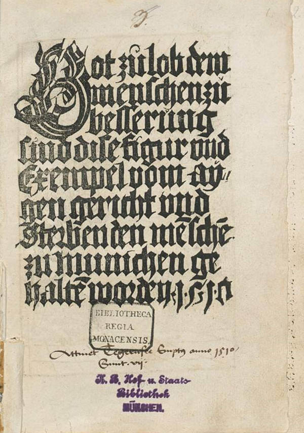 Titelseite des Münchner Eigengerichtspiels, Druckausgabe von 1510. (Bayerische Staatsbibliothek, Rar. 295)