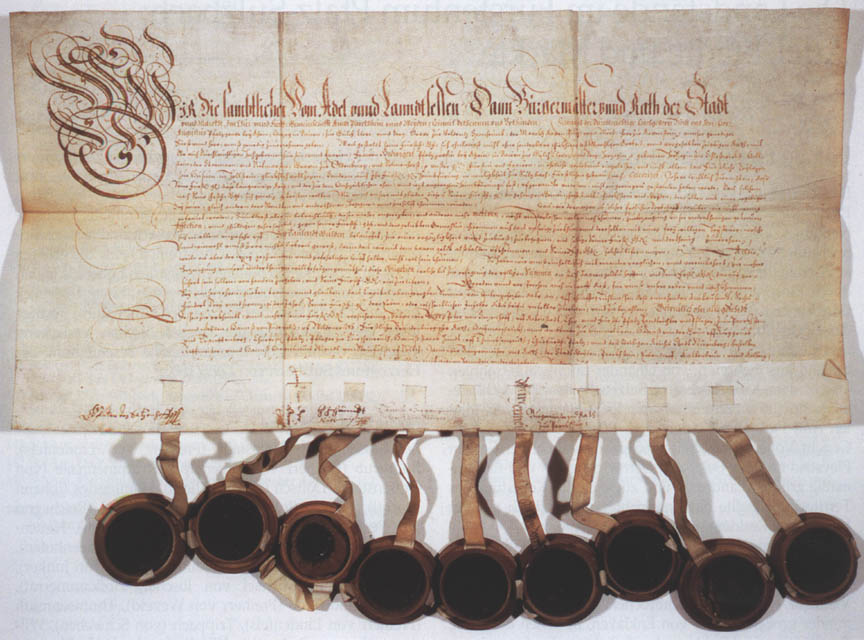 Städte, Märkte und Adel des Gemeinschaftsamts Parkstein-Weiden bewilligen Pfalzgraf August von Sulzbach [reg 1615-1632] anlässlich seiner Vermählung im Jahr 1620 eine Beisteuer [Staatsarchiv Amberg, Pfalz-Sulzbach, Geheime Registratur 50/16Urk]