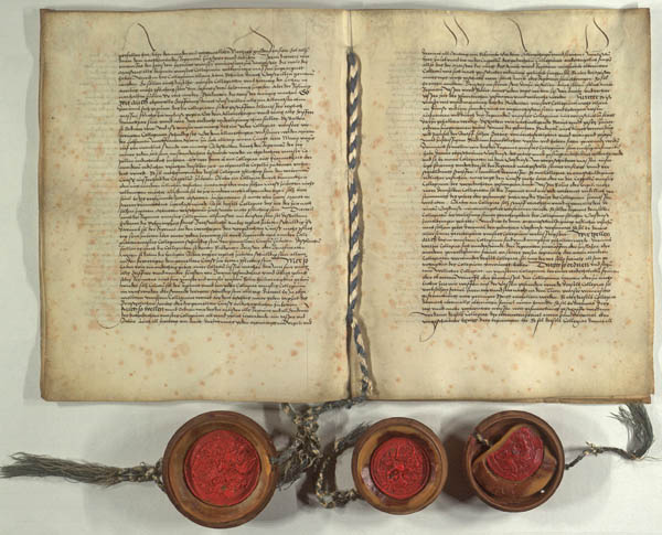 Die Stiftungsurkunde des Georgianums von 1494 ist ein umfangreiches Pergamentlibell. Besiegelt wurde sie von Herzog Georg dem Reichen von Bayern-Landshut (reg. 1479-1503), Kurfürst Philipp von der Pfalz (reg. 1476-1508) und Herzog Albrecht IV. von Bayern-München (reg. 1465-1508). (Archiv des herzoglichen Georgianums I/4)