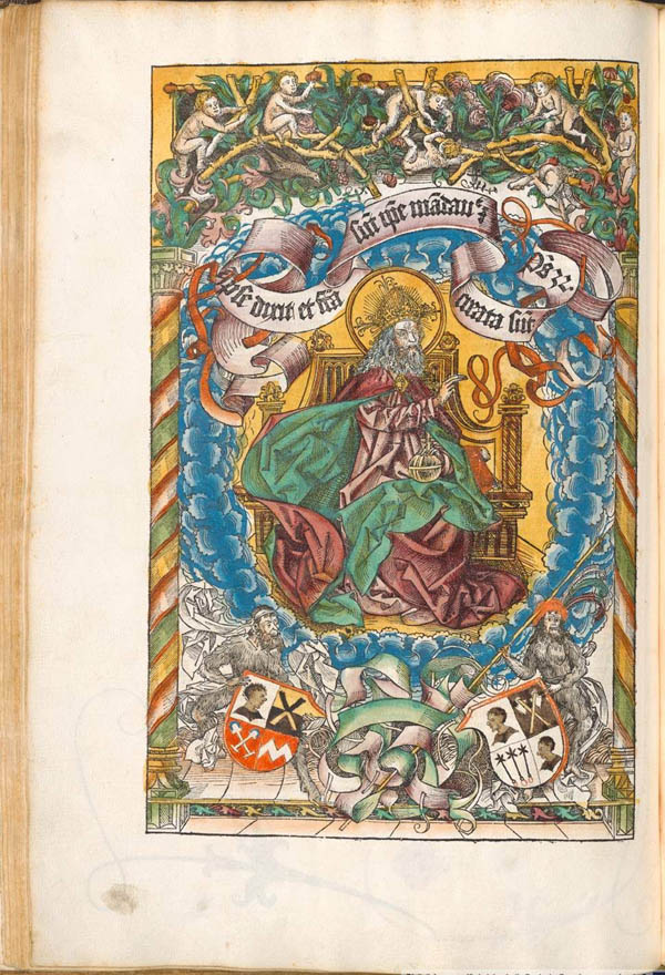 Der Holzschnitt am Beginn der Schedelschen Weltchronik zeigt Gottvater sowie zwei Wappen mit den Zeichen der Familien Schedel ("Mohrenkopf"), Grabner ("gekreuzte Schaufel", Schedels Mutter: Anna Grabner, gest. 1445), Heugel ("gekreuzte Dreschflegel?"; Schedels erste Frau: Anna Heugel, gest. 1485), Haller ("3 Sterne am Stab mit Ring?"; Schedels zweite Frau: Magdalena Haller, gest. 1505). (aus dem Privatexemplar des Hartmann Schedel, Bayerische Staatsbibliothek Rar 287, fol. 1v)