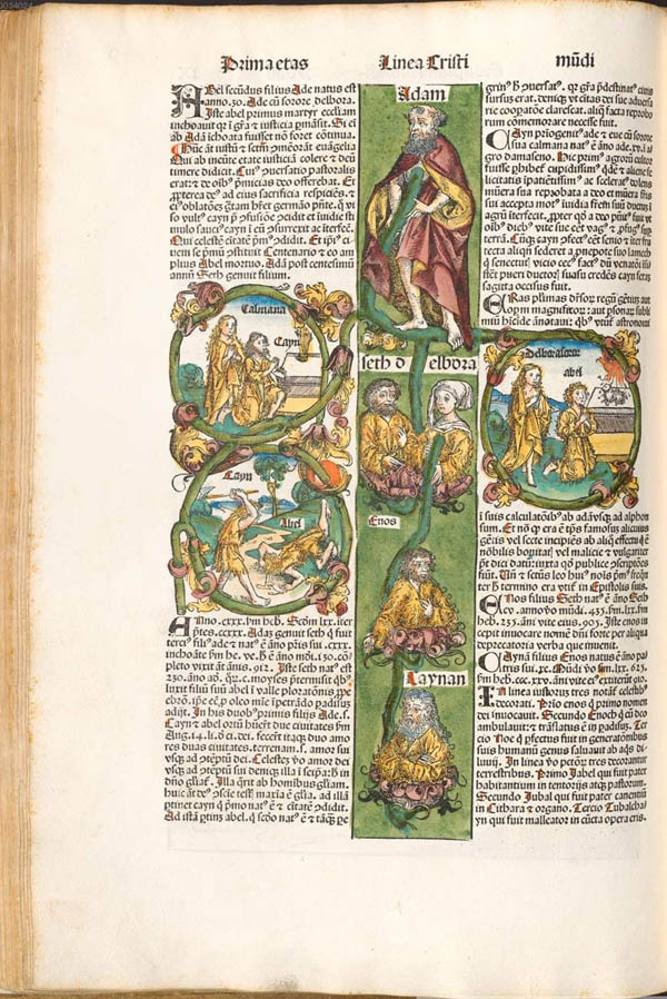 Textseite der Weltchronik Hartmann Schedels mit kleinteiliger Bilddarstellung. Abgebildet ist der Beginn des Stammbaums Christi im Abschnitt über das Erste Weltalter. Abgebildet sind Adam sowie seine Söhne Kain, Abel und Set, der die Linie fortführt. (Bayerische Staatsbibliothek Rar 287, fol. 9v)