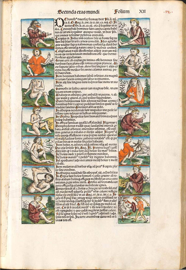 Im Abschnitt der Schedelschen Weltchronik über das zweite Weltalter finden sich diese Darstellungen monströser Menschenarten, wie sie von antiken Autoren beschrieben wurden. (Bayerische Staatsbibliothek Rar 287, fol. 12)