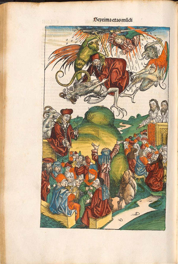 Am Beginn des Abschnitts der Schedelschen Weltchronik über das siebte Weltalter steht dieser Holzschnitt mit einer Darstellung der am Ende der Zeit auftretenden falschen Propheten. (Bayerische Staatsbibliothek Rar 287, fol. 262v)