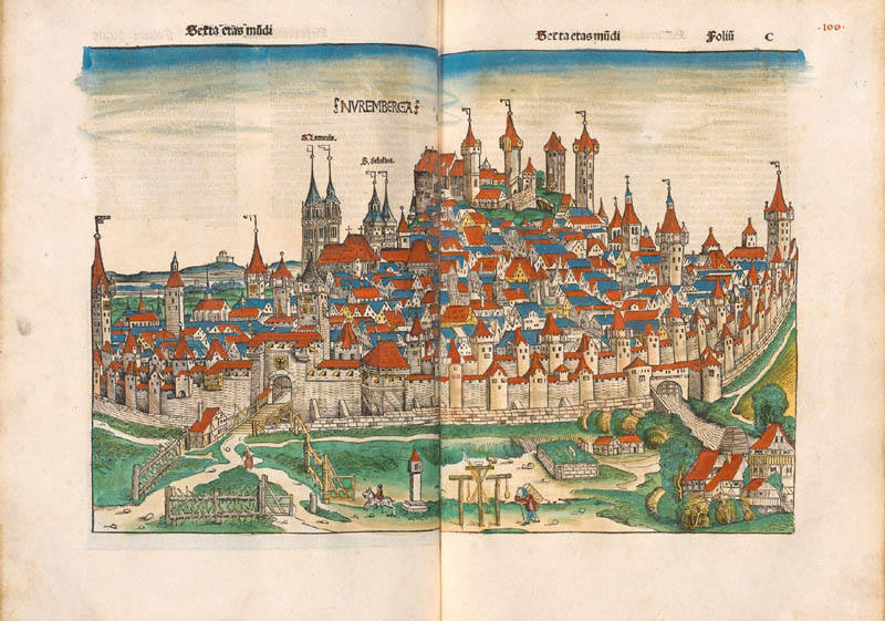 Darstellung der Stadt Nürnberg in der Schedelschen Weltchronik. (Bayerische Staatsbibliothek Rar 287, fol. 99v-100)