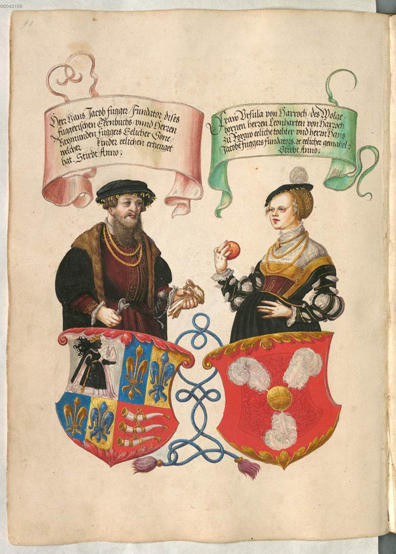 Johann Jakob Fugger (1516-1575) und seine Ehefrau Ursula von Harrach (1522-1554) im Ehrenbuch der Fugger, 1545-1549. (Bayerische Staatsbibliothek, Cgm 9460, 90)